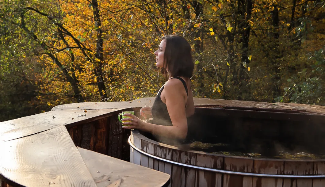 - Bain nordique privatif chauffé pour les Cabanes Spa, avec vue sur la nature environnante